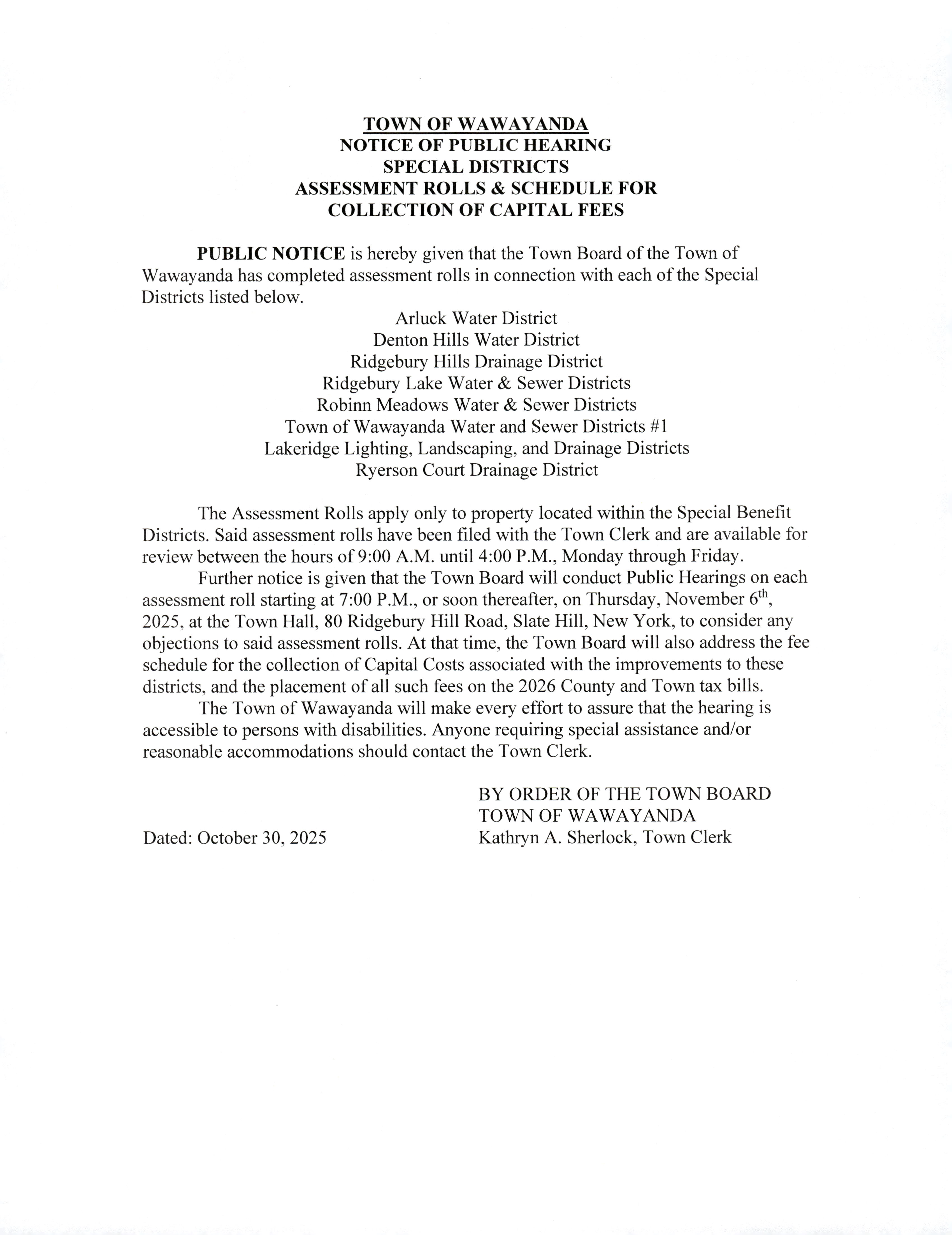 26 December 2026 Tax Collection Legal Notice December 26, 2025 By Kathy Sherlock Community News, Events, General 0 2026 Tax Collectors Legal Notice Related Articles Tax Collector Legal Notice 2025 Tax Collector Legal Notice 2025 Denton Hills Water District Notice to Remove Boil Water Notice 6-12-25 Denton Hills Water District Notice to Remove Boil Water Notice 6-12-25 Arluck Water District Notice to Remove Boil Water Notice 8-11-25 Arluck Water District Notice to Remove Boil Water Notice 8-11-25 Notice of Public Hearing Special Districts Assessment Rolls & Schedule for Collection of Capital Fees Notice of Public Hearing Special Districts Assessment Rolls & Schedule for Collection of Capital Fees Notice of Special Meeting PUBLIC NOTICE TOWN OF WAWAYANDA RESIDENTS PLEASE TAKE NOTICE that the Town Board of the Town of Wawayanda will be holding a Special Meeting at 9:00 A.M. on Tuesday, January 6th, 2025, for the purpose of scheduling a Special Meeting to discuss the options of consolidating the towns Water & Sewer District’s. The meeting will take place at Town Hall, 80 Ridgebury Hill Road, Slate Hill, New York. The Town of Wawayanda will make every effort to assure that the meeting is accessible to persons with disabilities. Anyone requiring special assistance and/or reasonable accommodations should contact the Town Clerk. Kathryn A. Sherlock Town Clerk Dated: January 5, 2026 Town of Wawayanda New York Public Notices Database New York Public Notices If you type in Wawayanda under Keywords, the most recent public notices will appear. You do not need an account to use this search feature. Comments are closed.