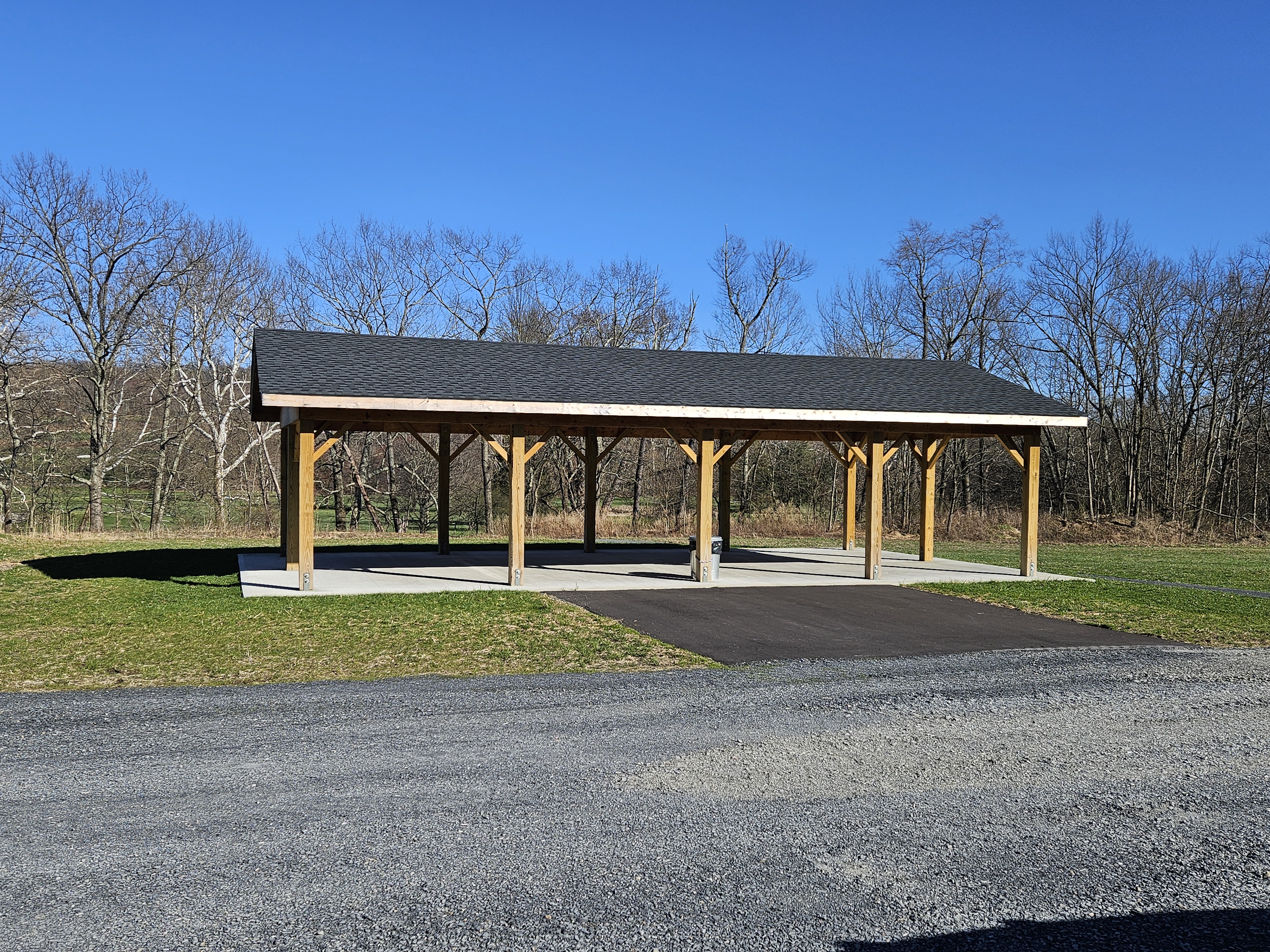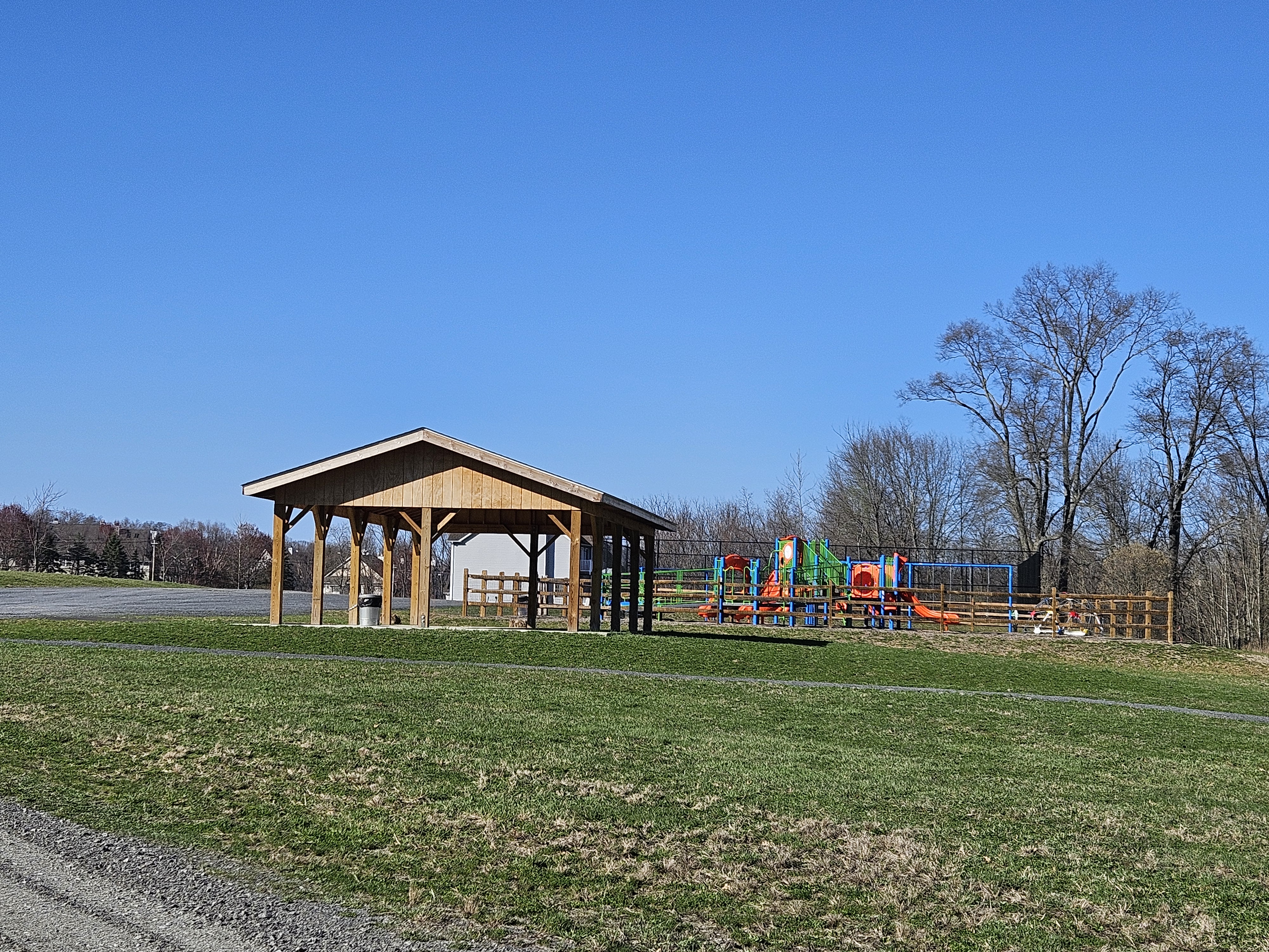A spacious picnic pavilion provides the perfect setting for a quiet lunch surrounded by nature. Nearby, a fenced children’s play area ensures a safe and fun environment where kids can explore and play.